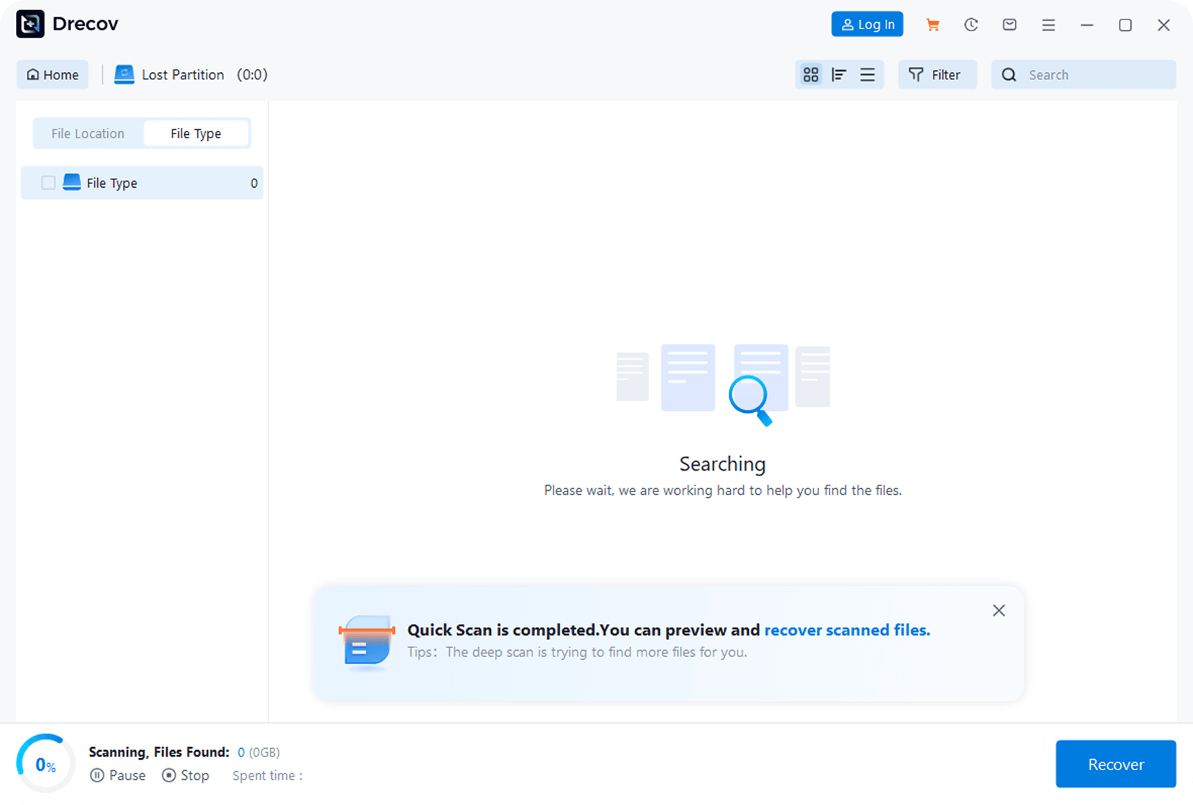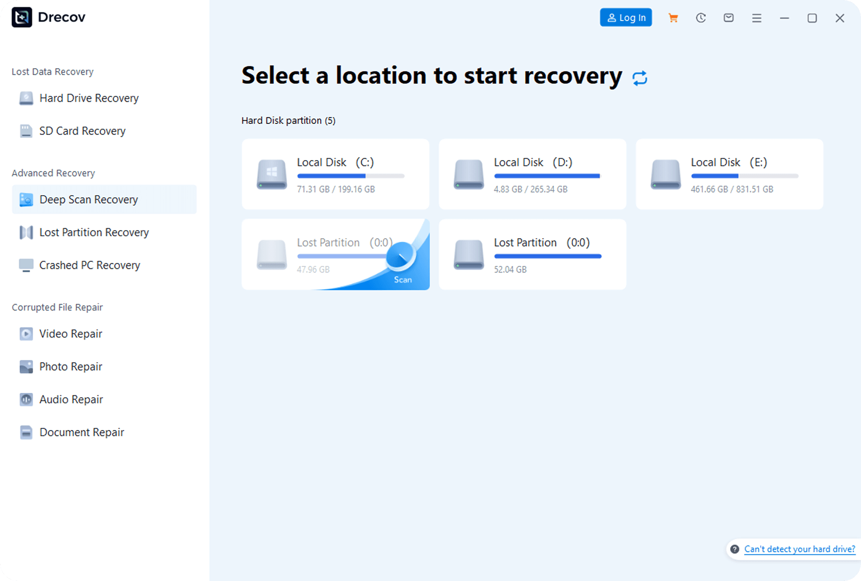 After launching the software, choose ‘Quick Scan’ or ‘Deep Scan’ mode, and specify the original storage location (e.g., hard drive partition, USB drive).