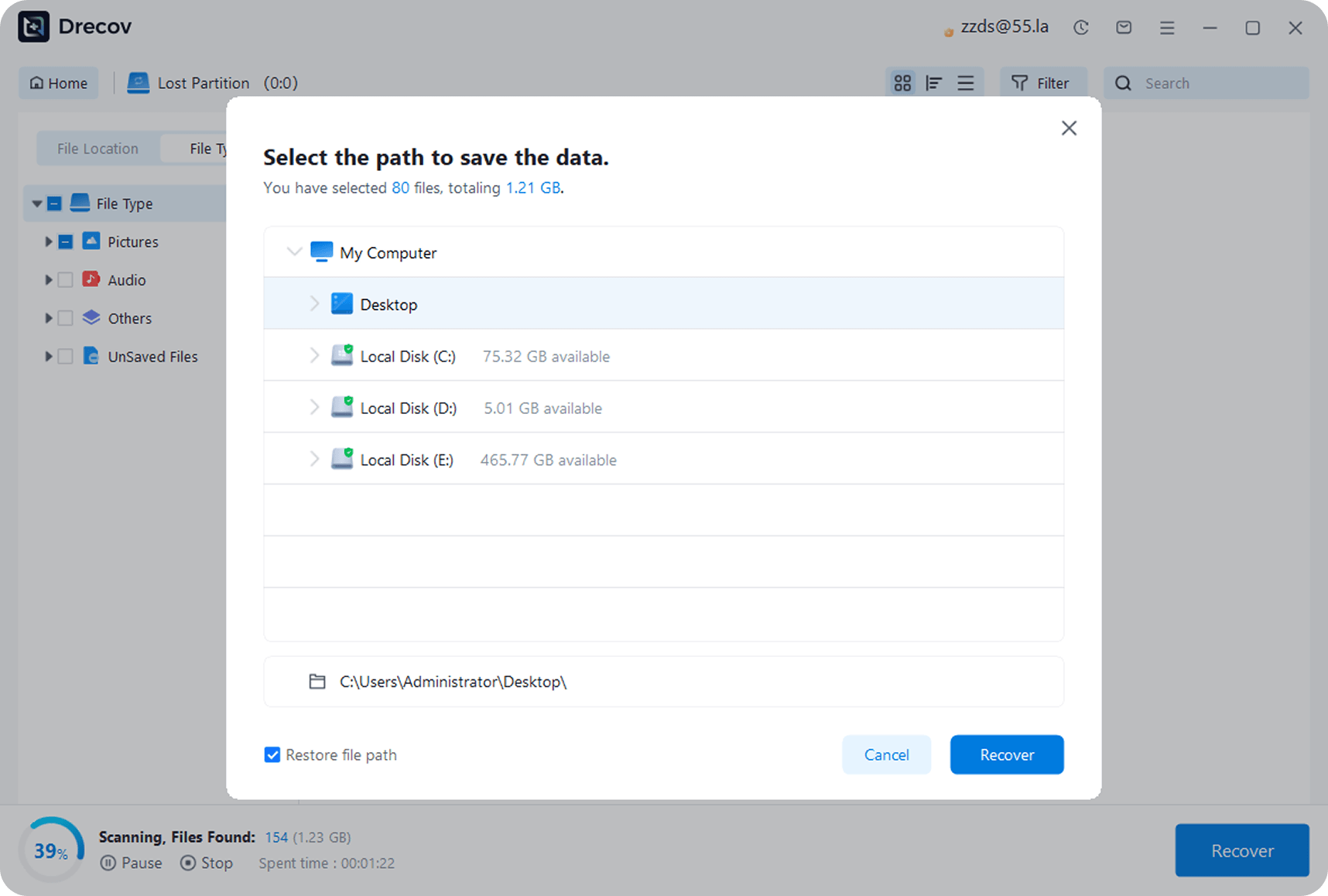 After scanning, preview the files, select the needed ones, click ‘Recover,’ and save them to a safe location different from the original (to avoid overwriting).