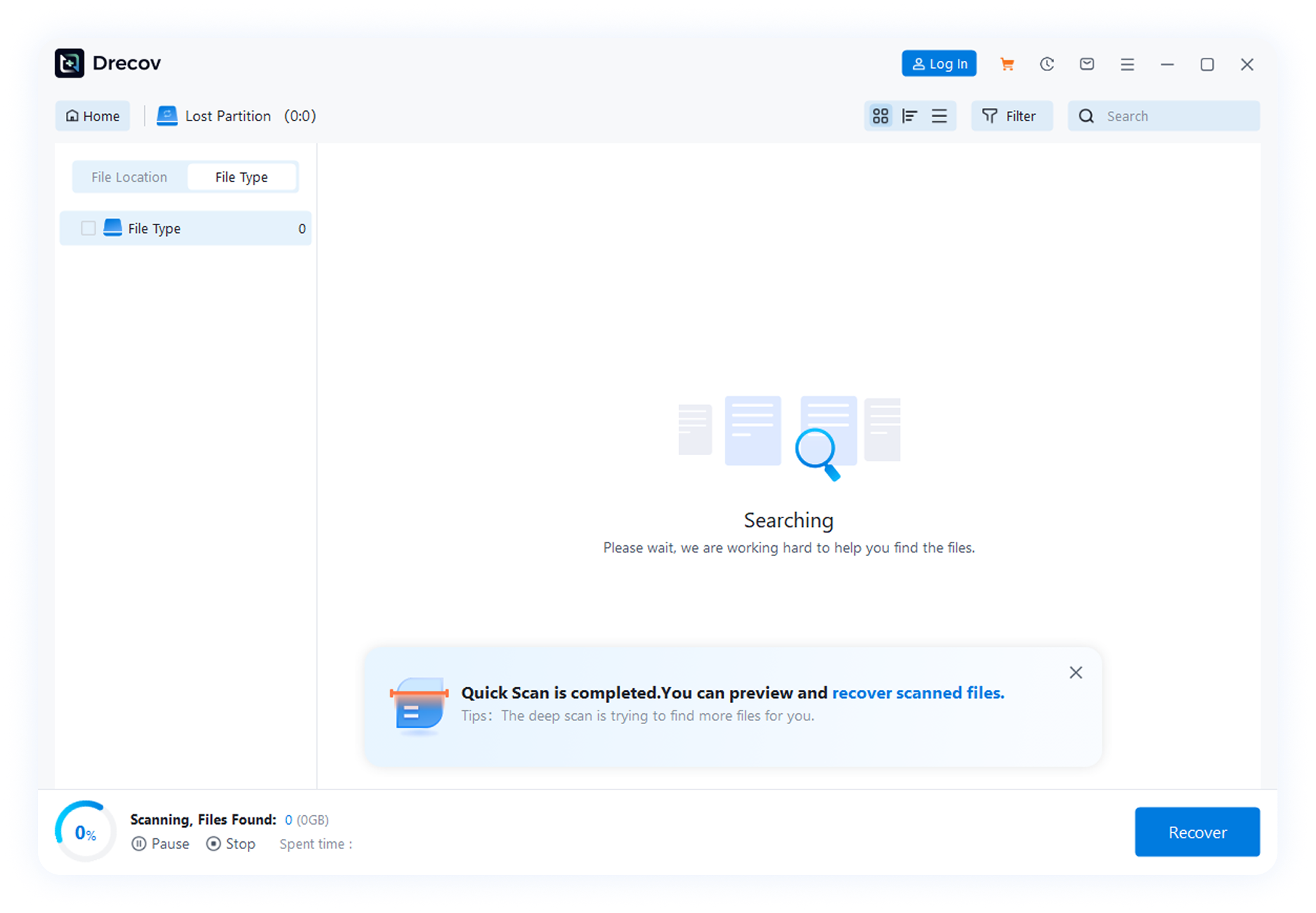 Select the target partition and initiate a scan. The deep scan option locates more files but takes longer.